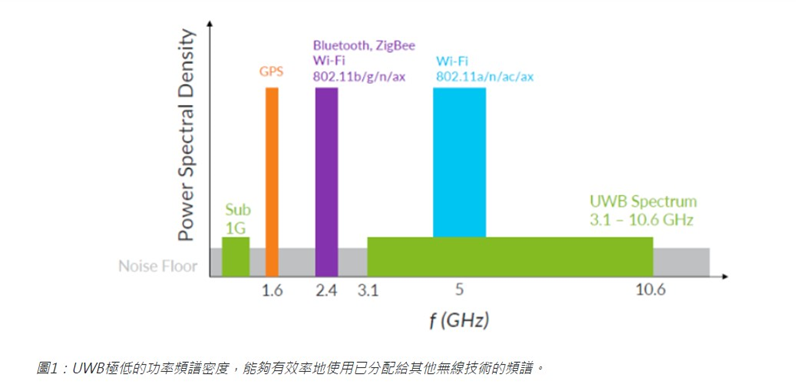 UWB的運作頻段基本上介於3.1和10.6GHz之間,通常會在6-8.5GHz之間運作,它僅用極低的功率訊號,因此若從Wi-Fi、藍牙及其他技術標準來看,他的傳輸處於雜訊底層(noise floor)之下,如圖所示。