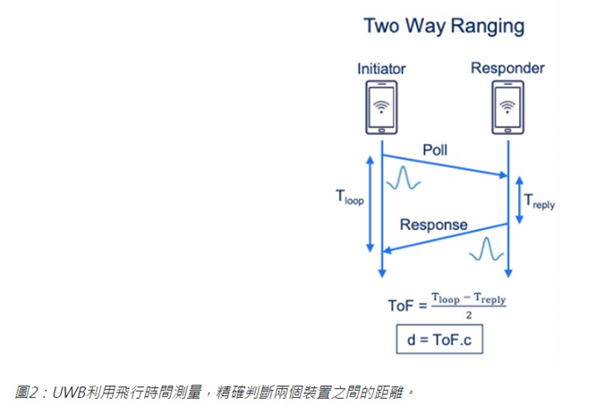 飛行時間測量(ToF)將提供發起器與回應器裝置之間的距離預估。如果使用多支天線,發起器也可以使用到達角度(Angle of Arrival)處理來估計回應器的角度或方向。