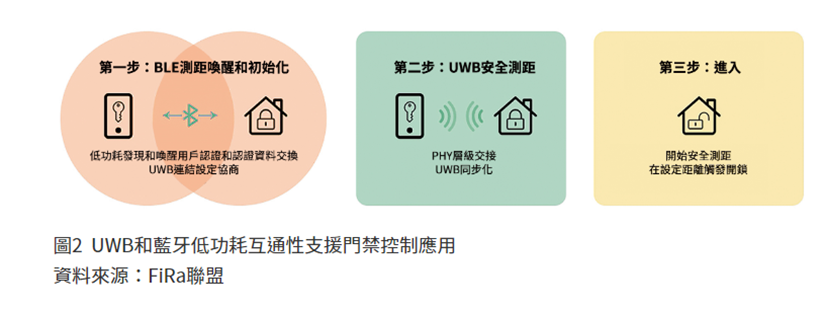 一項常見作法是同時使用這兩種方法:BLE提供長時間低功率,雖然測距較不準確,但使用者來到特定的距離範圍內時,BLE將無縫移交給UWB,以便進行安全且「精密」的測距存取驗證,這個組合方法已獲FiRa聯盟和國際汽車連線聯盟(CCC)採用,例如像是互通支援門禁控制。